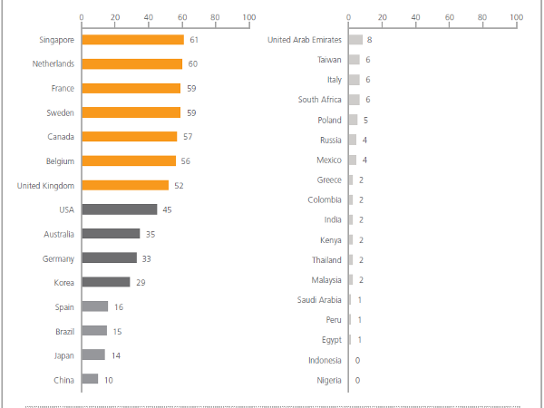 En la siguiente imagen extraída del estudio, se pueden ver los porcentajes estimados de transacciones realizadas por los consumidores con métodos diferentes al dinero en efectivo en distintos países de todo el mundo. Los países que aparecen en naranja son los que menos transacciones realizan en efectivo, mientras que los que aprecen en gris claro son los que más utilizan el dinero en efectivo. Cabe señalar que un país como EE.UU. se encuentre en el rango medio de la gráfica con sólo un 45% de transacciones electrónicas; y que haya países de Europa, como Italia o Rusia, en los que las transacciones realizadas en efectivo superen el 90%.